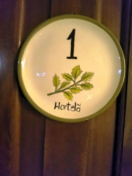 Neste espaço é possível encontrar várias obras para leitura, ficar sentindo o aroma das plantas que cercam a Pousada, dos chás e temperos que estão plantados em vasos. Afinal, desse jardim saem algumas das ervas dos chás das cinco. Essas mesmas ervas, deram nome aos quartos. Nós ficamos no Hortelã!
