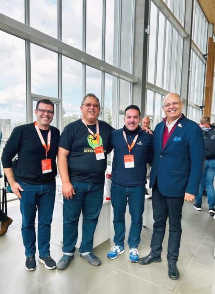 Da UFSM estiveram presentes os professores Flavi Ferreira Lisboa Filho (pró-reitor de extensão), Adriano Figueiró (coordenador científico do Geoparque Quarta Colônia) e André Borba (coordenador científico do Geoparque Caçapava), Na foto eles estão com o professor Artur Sá, coordenador científico do Arouca Geoparque Mundial da Unesco, Portugal, eleito nesse conclave como presidente da Rede de Geoparques Mundiais da UNESCO.