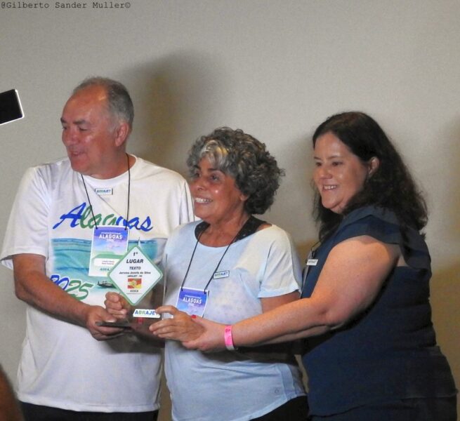 Ainda pela manhã de sexta-feira, foram destacados os profissionais responsáveis pelos melhores trabalhos jornalísticos (foto, texto, mídias sociais) produzidos sobre o 39º Congresso Nacional da Abrajet, realizado nas cidades de Piratuba (SC) e Marcelino Ramos (RS), em dezembro de 2024. Luiz Pires, e o ex-presidente Evandro Novak entregaram os trogéus para os vencedores. Também a diretoria Nacional da Abrajet fez homenagens e agradecimentos.