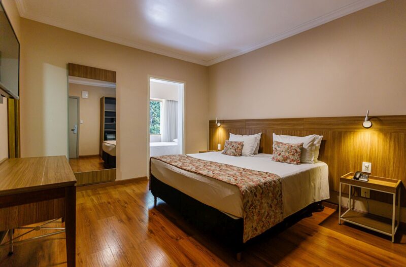 Inaugurado em 1942 e cercado por 40 mil metros quadrados de área verde, o Grand Resort Serra Negra conta com mais de 100 acomodações equipadas com ar-condicionado, TV a cabo, minibar, cofre, Wi-Fi e espaço de trabalho. As opções incluem quartos duplos, triplos, quádruplos e familiares.