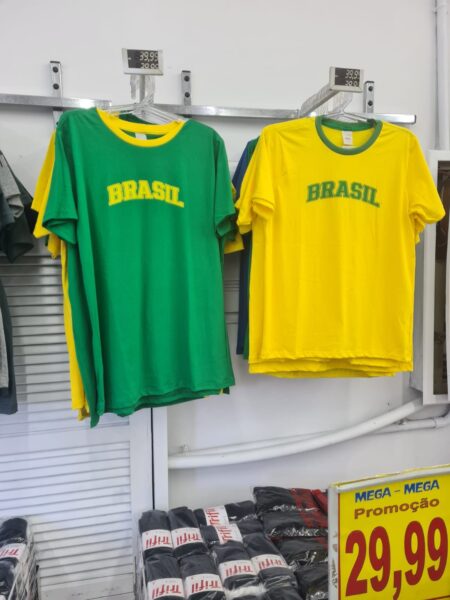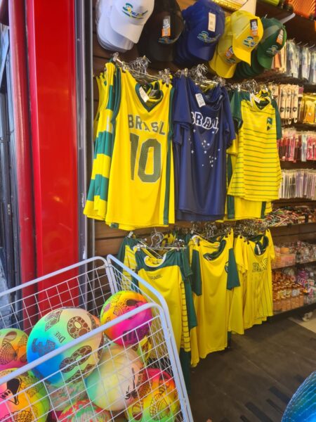 E com a proximidade de mais uma Copa, desta vez no Canadá, Estados Unidos e México, de 11 de junho a 19 de julho, lojas de departamento, de rua, supermercados de todo o Brasil já estão colocando a venda os muitos produtos e alegorias que farão a festa na Copa de 26. As fotos acima foram feitas em Porto Alegre/RS.